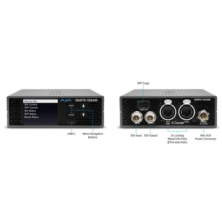 Create an audio bridge between your video signal with embedded audio and a Dante audio network with the DANTE-12GAM 12G-SDI/Dante 64-Channel Embedder/Disembedder from AJA. This high-performance audio over IP converter provides 12G-SDI connectivity with 64 channels of embedded audio and the capability to de-embed up to {name} channels of audio onto an existing Dante network. This model comes with a one-channel 12G-SDI single-mode LC fiber transceiver SFP.