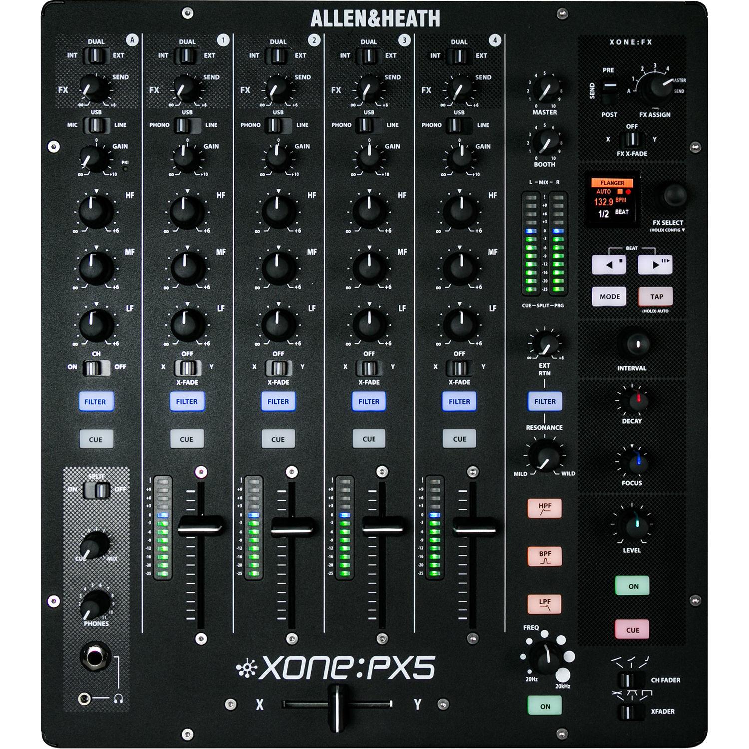 The XONE:PX5 from Allen & Heath is a 4+1 channel DJ mixer with a built-in sound card offering professional quality in a simple, yet intuitive layout for professional DJs, serious home enthusiast and night clubs. The mixer features the XONE analog filter with resonance control, 3-band EQ, a replaceable VCA crossfader, and the X:FX send and return that incorporates any outboard FX unit. The built-in FX technology offers new levels of manipulation with the XONE:Xcite FX suite of performance-focused delays, reverbs, modulators, flangers and distorters, which are all assignable through simple hands-on control for fine-tuning the FX.