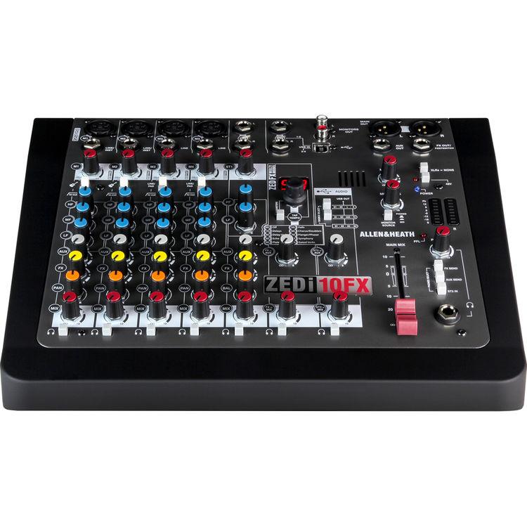 In the analog realm, the ZEDi-10FX is crafted with preamps modeled on the Allen & Heath GS2-R24. These channel strips aim to provide warmth, low noise, and a vast expanse of headroom. On-board EQs also come standard with the unit. Two channels feature a button that converts line-level signal into high-impedance jacks, meaning guitar players need not lug an extra DI box around should they wish to go direct into the board.