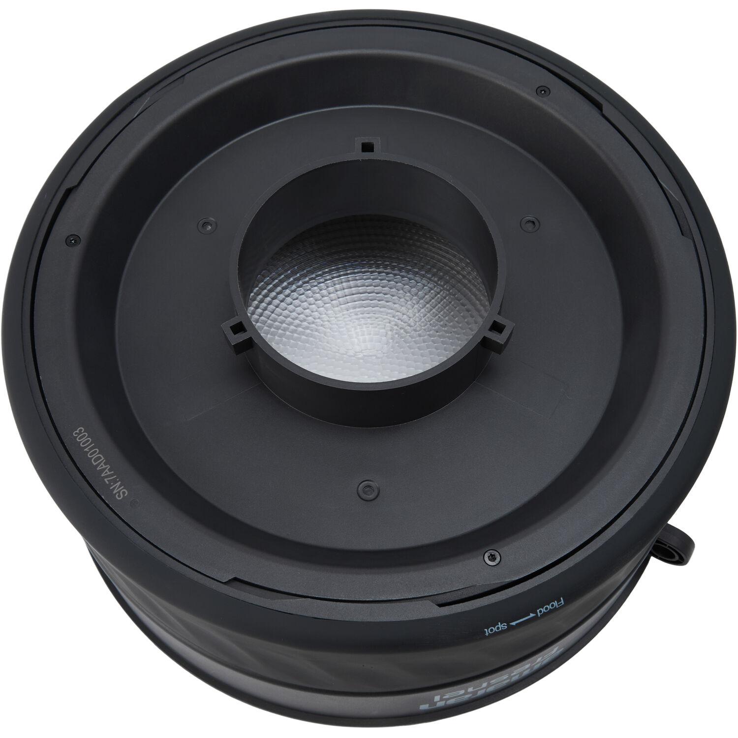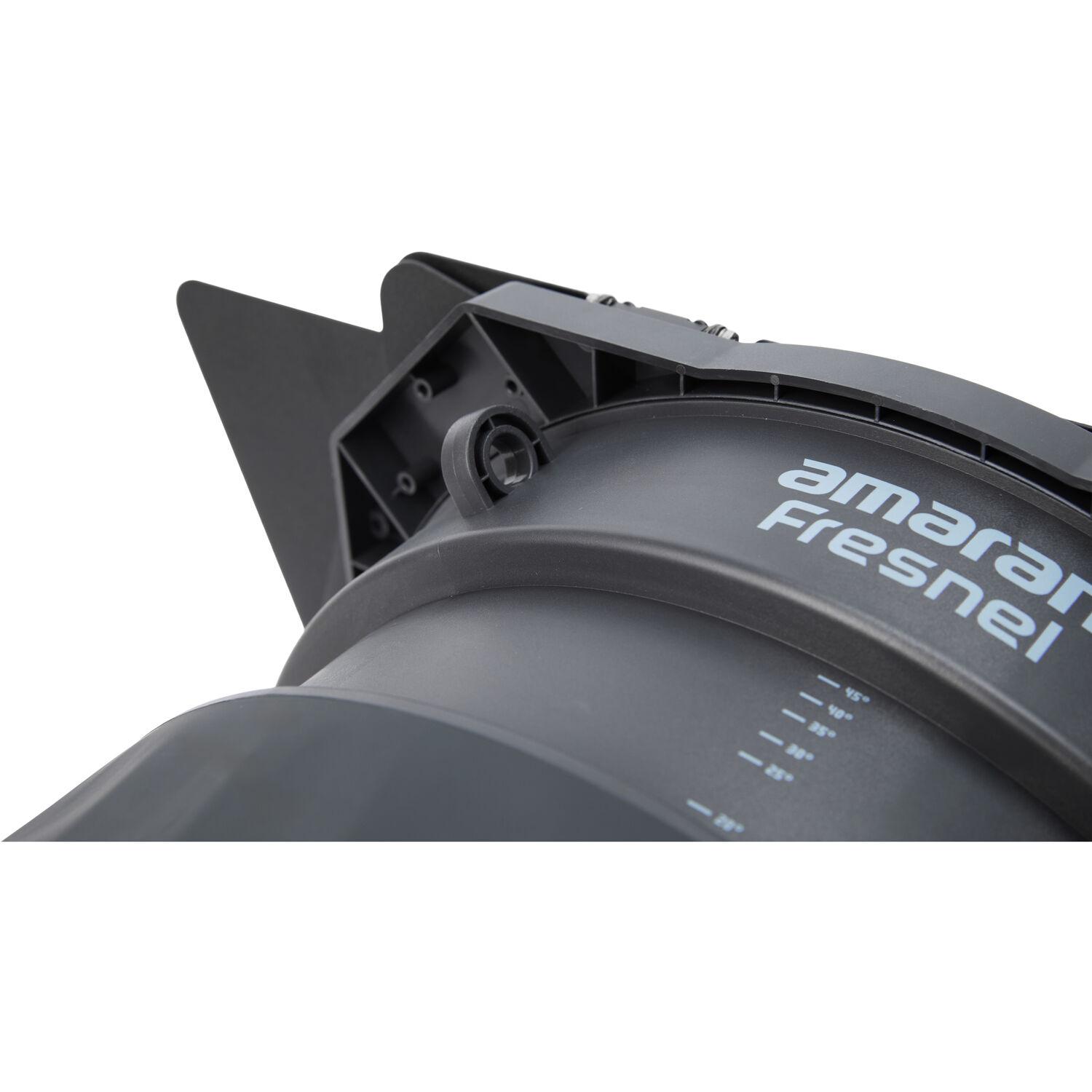 This amaran Fresnel is an adjustable 15 to 45° Fresnel modifier that fits the separately available 360c and 660c lights. It employs a 9.6" glass lens design to amplify the light output. At 9.8', it produces up 18,110 lux with the Ray 360c or an impressive 31,700 lux when combined with the 660c (both at 4300K, 15°). This Fresnel has a variable spread from an intense 15° spot to a broad 45° flood with a smooth falloff from center to edge. amaran includes four-leaf barndoors for finer control so you can shape, cut, and control the spread and direction of light, while eliminating unwanted spill. A carry bag is also supplied to store and transport the Fresnel.