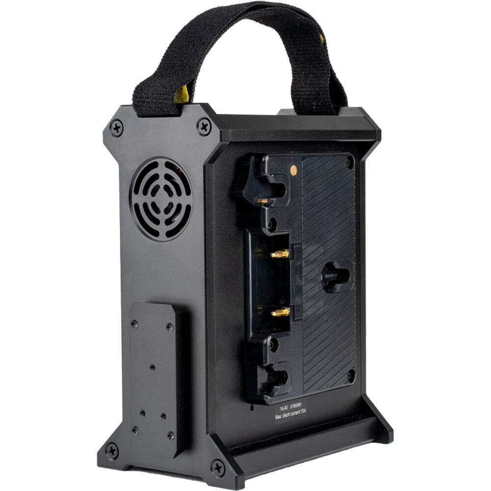 This Gold Mount 2-Bay Battery Power Station from Aputure will power your Light Storm 600d or Nova 300 light with an optional battery. It can also add to your shooting time if you use it with two batteries simultaneously mounted on the fixture.