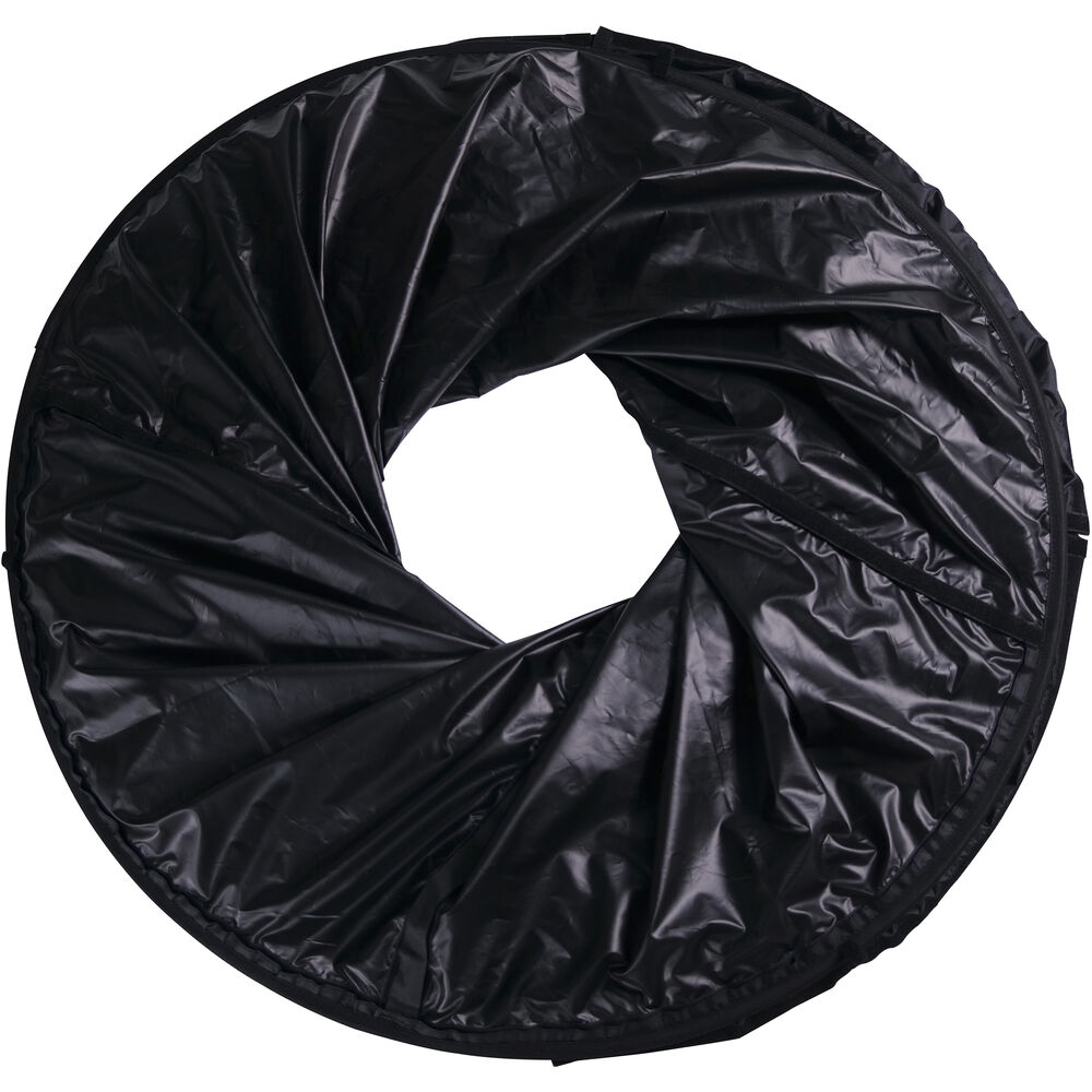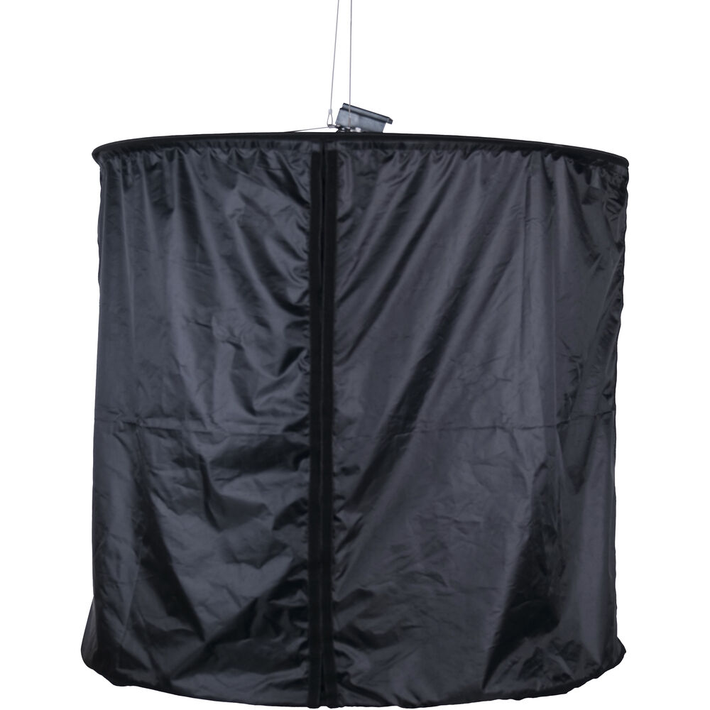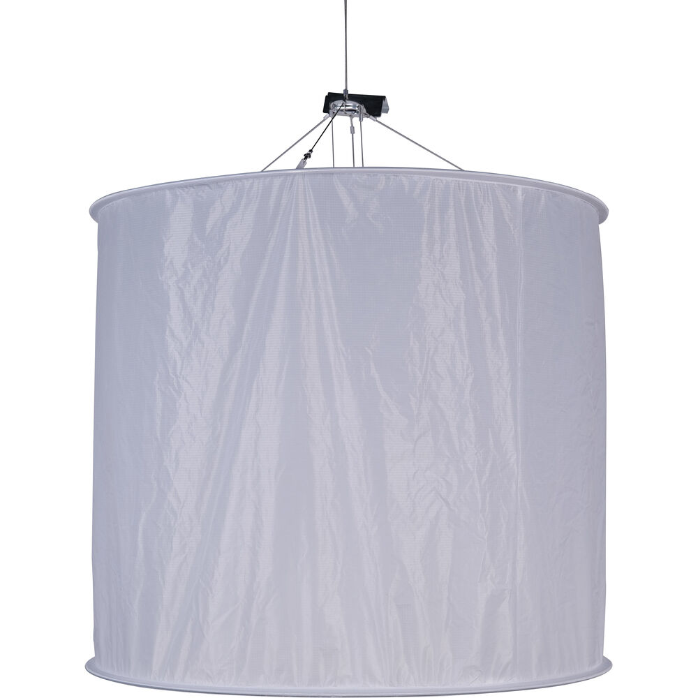 The Aputure Space Light Diffuser is designed for the Nova P600c LED Panel and features a cylindrical design, which is achieved by mounting the light into a suspended circular-shaped frame. This allows the panel to spread light 360° over a wider area, reducing edge shadows, and making it suitable for soft light environments. Offering 360° illumination with an adjustable light control skirt, the inner layer of the light control skirt is slightly reflective, and in combination with the black outer layer, it completely eliminates spill light. A versatile modifier with multiple creative applications, when only one side of the skirt is rolled down, the soft light is given direction. Meanwhile, when the skirt has been completely closed, the resulting light is projected downwards through a circular aperture for dramatic effect.