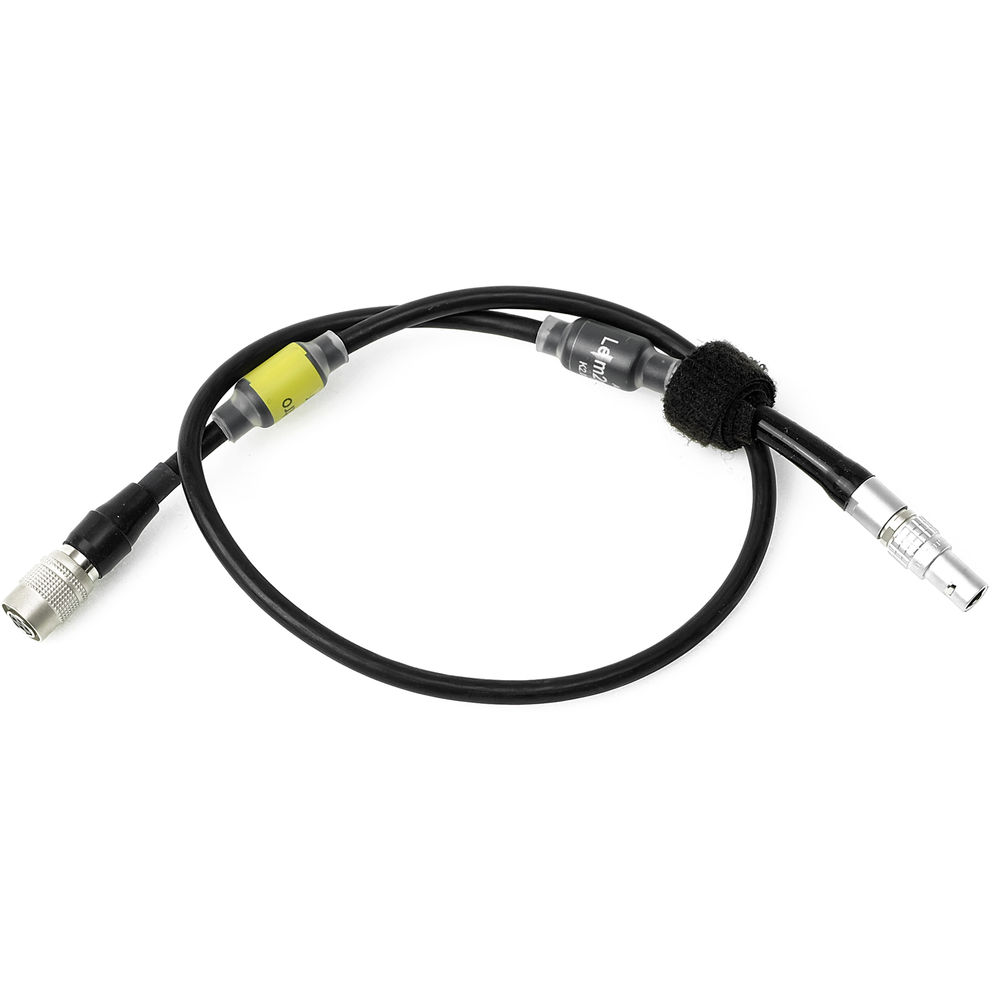 This 12V Power Cable (20") from ARRI features a 2-pin LEMO-type (male) connector on one end, and a 4-pin Hirose-type (female) connector on the other. It can be used to transmit power from an ARRI camera to a 12V accessory like an on-board monitor, an ARRI WVR-1 receiver, a battery adapter plate, or a power splitter box. This is a 20"-length cable.
