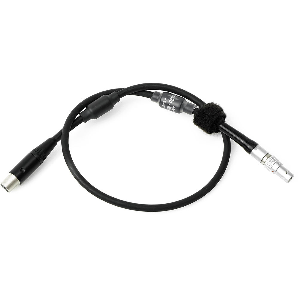This 12V Power Cable (20") from ARRI features a 2-pin LEMO-type (male) connector on one end, and a 4-pin mini-XLR (female) connector on the other. It can be used to transmit power from an ARRI camera to a 12V accessory like an on-board monitor, an ARRI WVR-1 receiver, a battery adapter plate, or a power splitter box. This is a 20"-length cable.