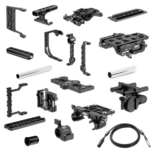 The ALEXA Mini LF Accessory Set 15 Advanced from ARRI offers an array of key accessories suited for handheld setups and for use with gimbal and stabilizers like the MAXIMA and Trinity. This 15mm studio rod-based bundle includes a 15mm LWS bridge plate adapter, a stabilizer plate, a compact bridge plate with shoulder mount, a 12" dovetail, a set of accessory mounting brackets, a CCH-2 top handle, an HEB-3 handle extension, an EVF mounting system, an RAB-1 Clamp 2, a 6.6' camera power cable, and more. This set requires a separately available distribution box, battery, and pair of rods.