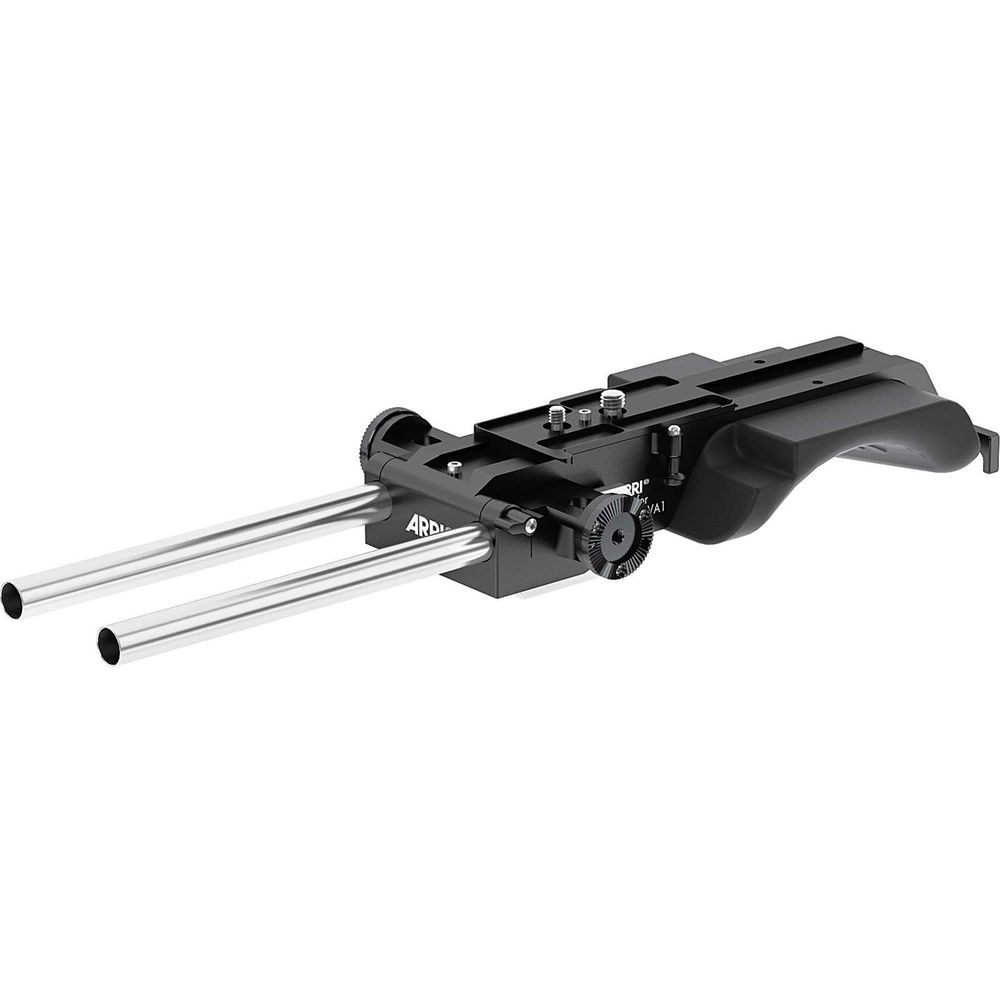 The ARRI Basic Set for Panasonic EVA1 includes a 15mm LWS shoulder pad baseplate, a top plate for the camera, and dual 9" 15mm rods. The baseplate is compatible with select bridge plates and VCT-style tripod adapters, and the top plate offers 15mm LWS rod support.