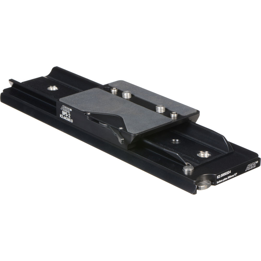 The bridge plate features two sets of 3/8"-16 threaded mounting studs and a locking lever to hold it secure on the dovetail plate. The included dovetail plate is 12" long and features four 3/8"-16 threaded mounting holes, so you can choose where to position it on your tripod. At the front of the plate is a fixed pin to prevent your camera from moving or falling. A spring-loaded safety stop at the rear enables you to slide the BPS-2 on and off the dovetail plate.