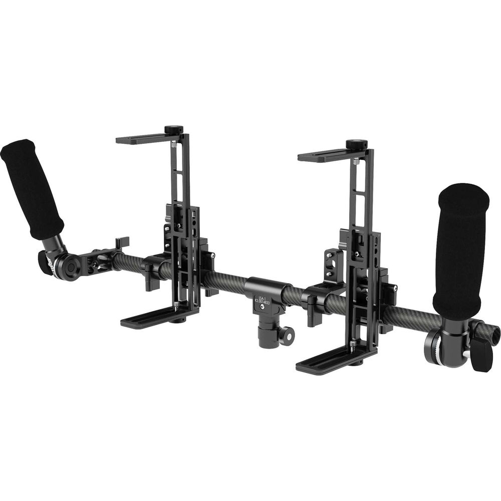 The Director's Monitor Support DMS-1 from ARRI is a lightweight handheld monitor support that can accommodate two up to 9" monitors and two WVR-1 wireless video receivers. This modular set includes two AMM-1 adjustable monitor mounting brackets, two RMB-5 19mm rod-mounting brackets for the wireless receivers, two RA-4 rosette to 19mm rod adapters, one LSA-1 19mm rod to lighting spigot adapter, two handgrips, a pair of SBA-1 ENG shoulder belt adapters, and one 21.3" 19mm carbon fiber support rod.
