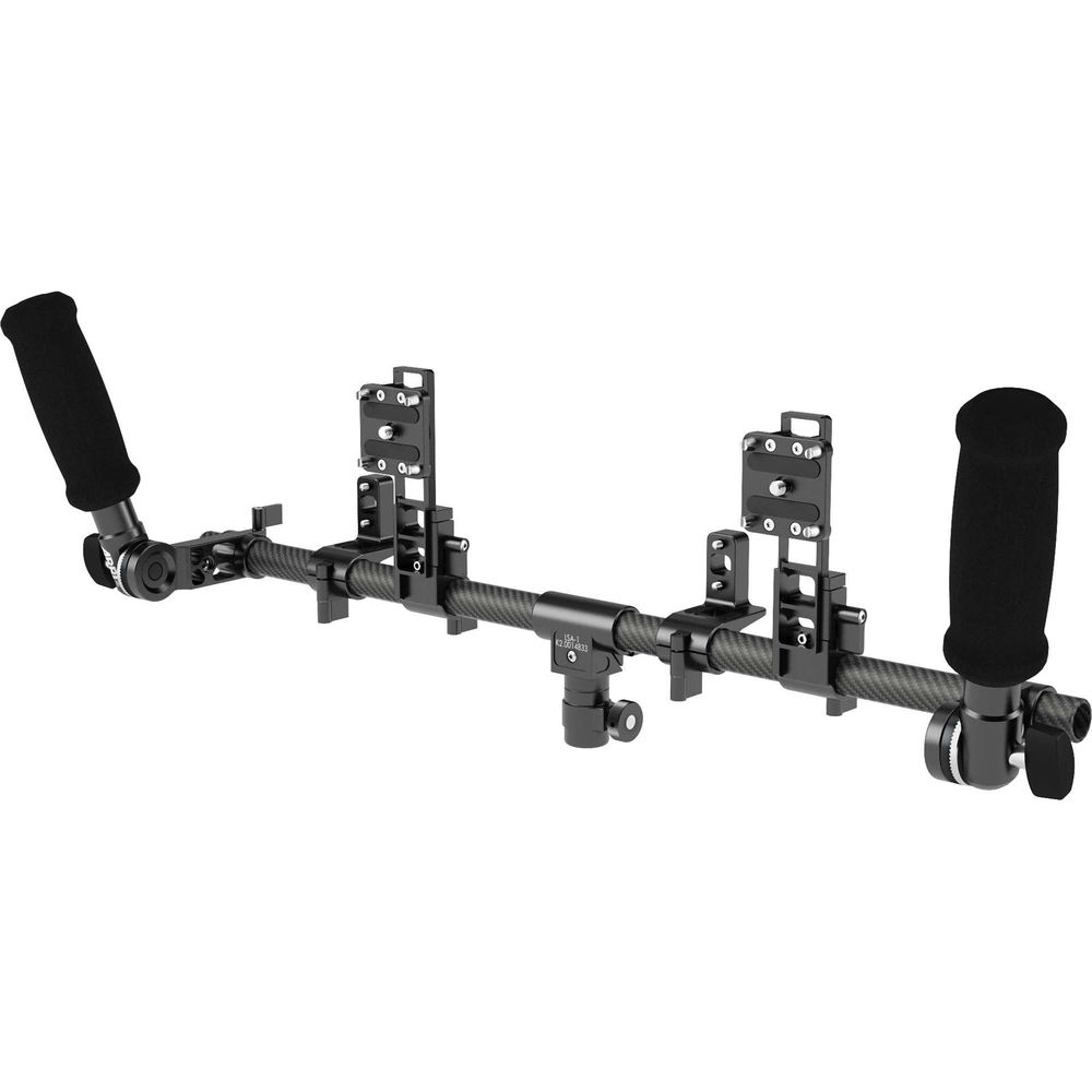The Director's Monitor Support DMS-1 from ARRI is a lightweight handheld monitor support that can accommodate two Transvideo monitors and two WVR-1 wireless video receivers. This modular set includes two rod mount adapters for mounting the monitors, two RMB-5 19mm rod-mounting brackets for the wireless receivers, two RA-4 rosette to 19mm rod adapters, one LSA-1 19mm rod to lighting spigot adapter, two handgrips, a pair of SBA-1 ENG shoulder belt adapters, and one 21.3" 19mm carbon fiber support rod.