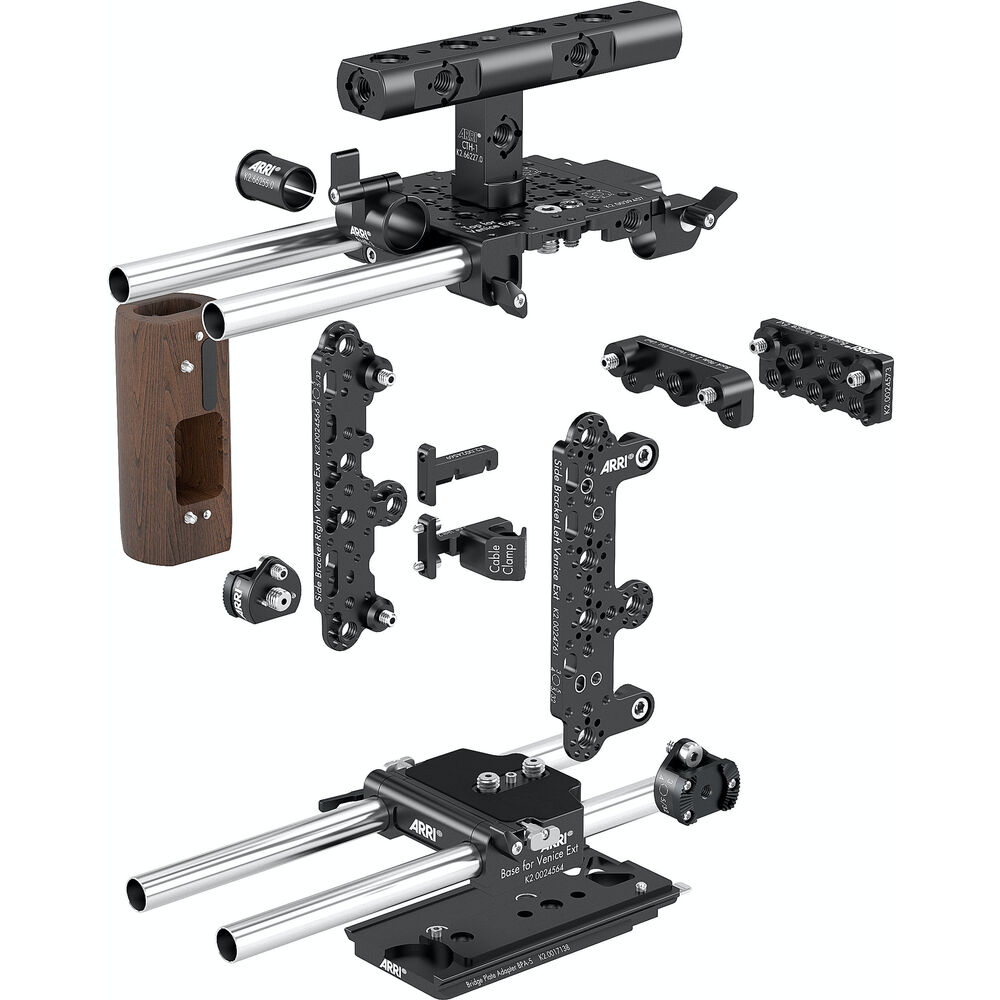 The Pro Set for VENICE Extension Unit 1/2 from ARRI provides a robust selection of dedicated cage-type support components for the Sony VENICE Rialto Extension Unit 1 or 2. This set includes a front 15mm LWS baseplate, a top handle, a wooden handgrip, an RMB-3 rod bracket, a BPA-5 bridge plate adapter, a cable clamp, 5.5 and 9.4" 15mm rod sets, cheese plate-style top and back plates, left and right brackets, and more.