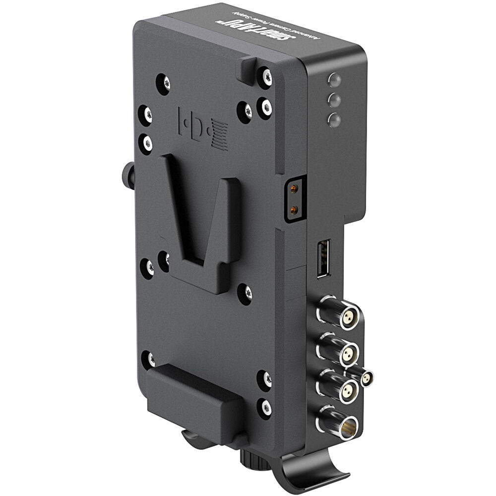 Configured for use with a pro-style V-mount battery, the plate includes a bottom bracket for mounting to separately available 15mm LWS support rods. The plate provides a total of 80W of accessory power via three 2-pin LEMO, one D-tap, one 00.302 LEMO, and one standard USB Type-A output ports.