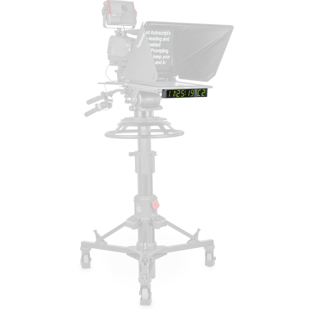 The CLOCKPLUS-IP Timecode Display for EVO-IP and EPIC-IP Prompters simply attaches to the talent monitor of your EVO-IP monitor. It also integrates with the EPIC-IP prompter system. The CLOCKPLUS-IP receives its information through the prompt monitor of an EVO-IP or EPIC prompter system, and it displays the timecode in two-digit displays for hours/minutes/seconds with either a 12- or 24-hour mode. It supports NTP via Ethernet, LTC via BNC, VITC via a composite signal over BNC, and D-VITC via an HD-SDI signal over a BNC connector. Please note that VITC and D-VITC require a VITC/D-VITC enabled monitor. The CLOCKPLUS-IP also displays tally by changing the color of its display.