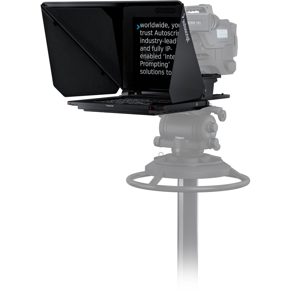 The EVO-IP Prompt Monitor Kit with VITC/D-VITC Inputs includes a 17" prompting monitor, carbon fiber hood, mounting system and camera carriage assembly to suit ENG cameras and camcorders, Tally sensor and cable, cable tray, and power supply. The monitor interfaces directly with a WinPlus-IP software (available separately) using its LAN connector, and supports also HD-SDI, VITC, and composite inputs. Along with its thin and lightweight design, the monitor incorporates four tally lights, providing 270° of visibility around the teleprompter. It features a high-bright, high-contrast solution for clear and readable text in virtually any brightness condition.