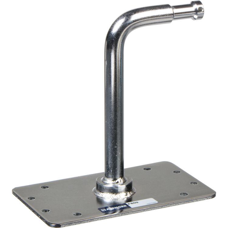 This is an Avenger F809 Right Angle Baby Plate. The steel plate has a welded 5/8" Baby pin bent to 90° that extends 6.0" from the wall. Eight anchor holes accept screws or nails.