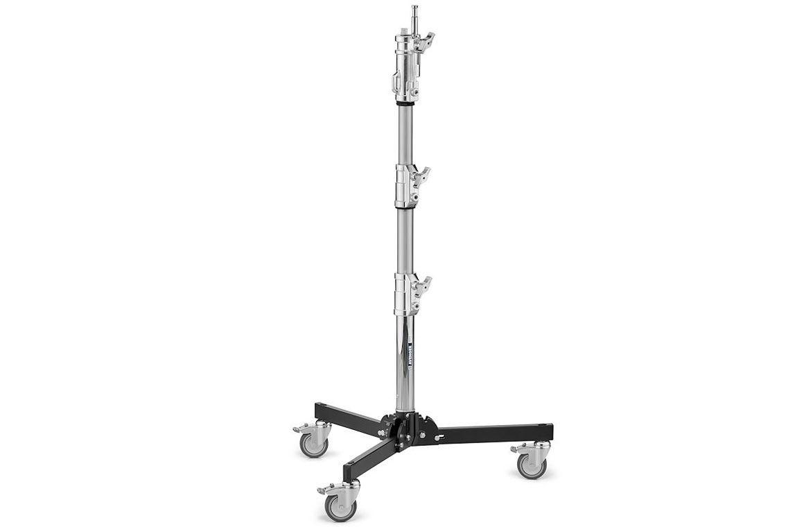 The 4' Junior Roller Low Boy Stand with Combo Head is a heavy-duty, chrome and black steel and aluminium support that features a low base for extra stability, braking wheels, two risers, and both a female 1-1/8" junior receiver and a retractable 5/8" baby stud. The legs fold up for transport and storage. The stand weighs 14 lb and has a stable 29.5" footprint.