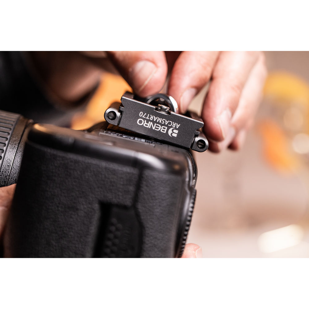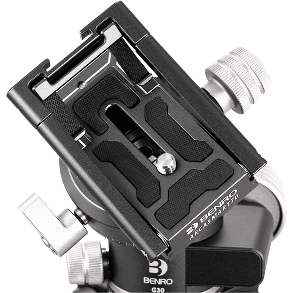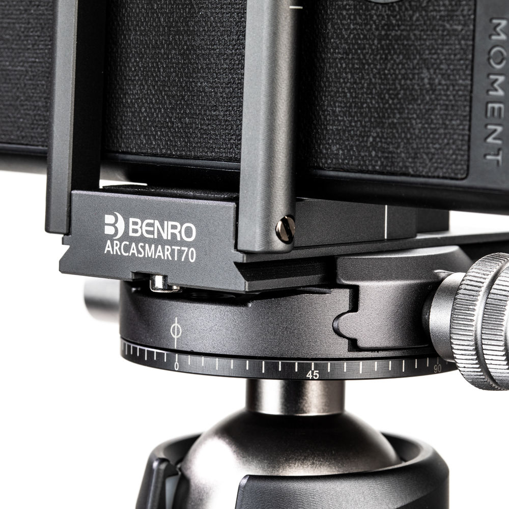 The 70mm Arca-Swiss Plate with Smartphone Adapter from Benro is a 2-in-1 camera plate and smartphone adapter designed into one device. The unit features an Arca-Swiss style camera plate compatible with most Arca-Swiss style ballheads, 3-way heads, and gimbal heads, and the included adapter allows you to mount a smartphone to the plate for use with a tripod head for both photo and video applications. The plate is constructed out of high-quality CNC machined aluminum, and stainless steel rods securely mount a smartphone to the camera plate. Additionally, a cold shoe mount is also provided for attaching additional accessories such as a light or microphone.