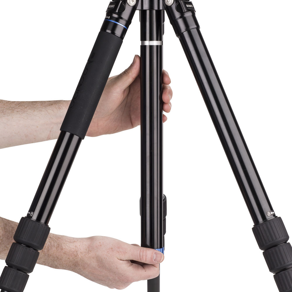 The tripod has a center column with a leveling adapter on the end that allows you to adjust the angle of the fluid head without having to readjust the tripod legs. The combination of the reverse-folding design and center column allows the tripod to have a max height of 72" (with the head attached) while being able to fold to a very compact size. Furthermore, the tripod legs are able to spread wide to provide a low-angle minimum height of only 13.4" (also with the head attached). With rubber feet and spikes underneath them, the tripod can be used on virtually all surfaces. To convert it to a monopod, the center column is used as the core component. One of the legs of the tripod unscrews from the tripod and secures to the center column, and together the two form a fully functioning monopod.
