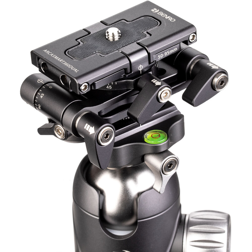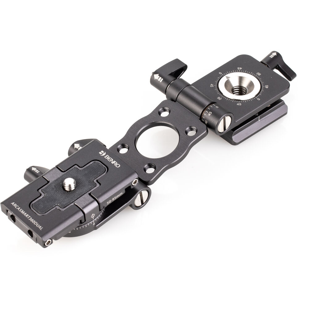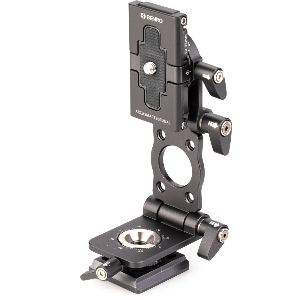 The Benro's ArcaSmart 360 Dual Plate is an innovative quick release plate that features multi-angle functionality and a uniquely designed phone holder that allows you to adjust your camera or phone to a variety of positions that are perfect for your shot. Compatible with mobile devices as well as DSLR and mirrorless cameras, this meticulously designed plate lets you switch from landscape to portrait orientation by simply unlocking the knob and rotating. This head also provides a full 360° panning range to any tripod or monopod that it's attached to, which is made even more convenient by the 3/8"-16 threads in the base.