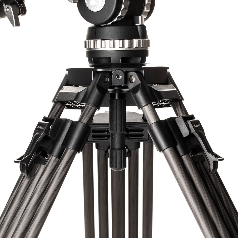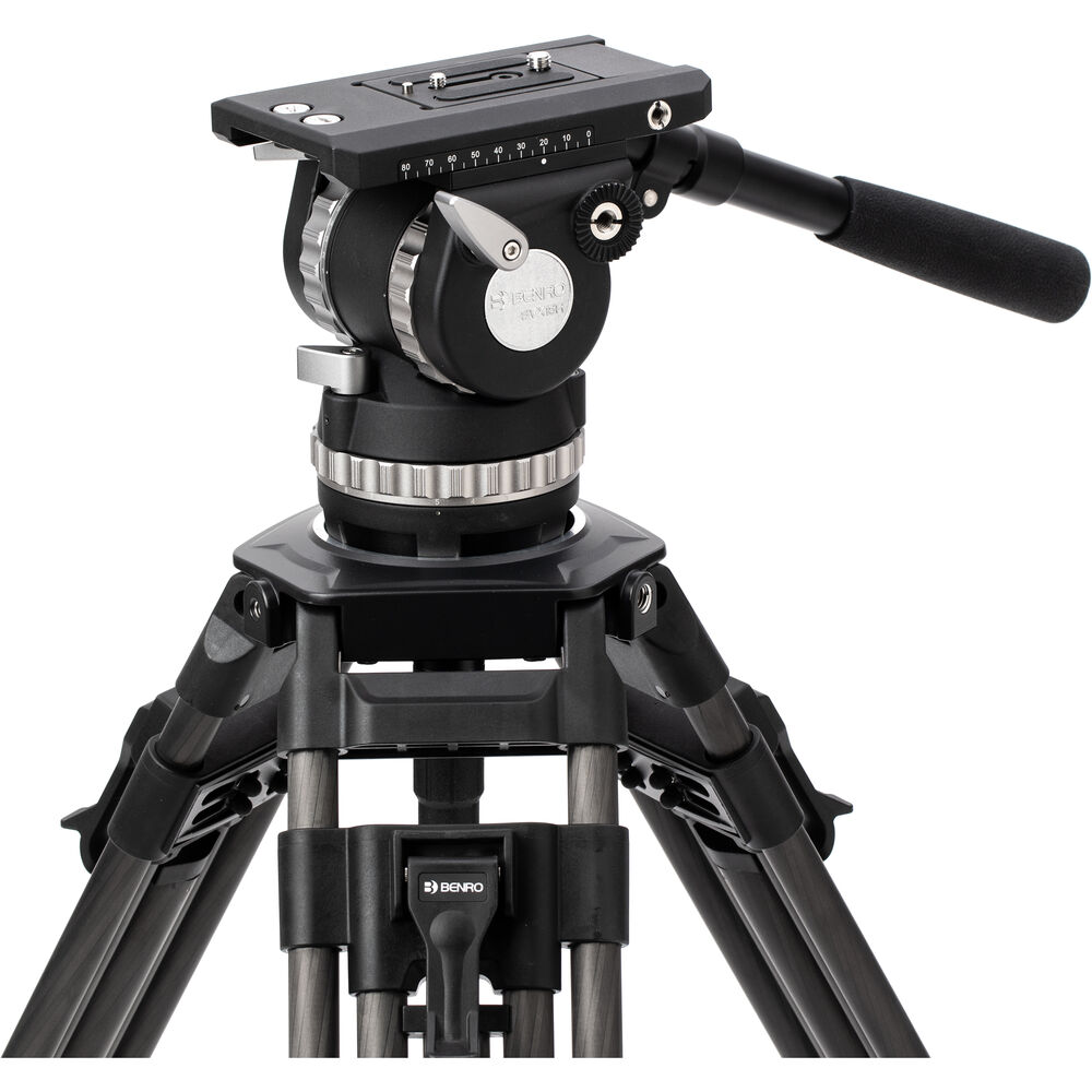 Ideal for teleprompters or large camera rigs, the Benro BVX18 Carbon Fiber Pro Video Head and Tripod includes both a video head and tripod system with a load capacity of 39.6 lb. The BVX18 can reach up to 66.5 inches and features two-stage, three-section legs with flip locks. 8-step pan and tilt controls allow for quick and easily duplicated movements.