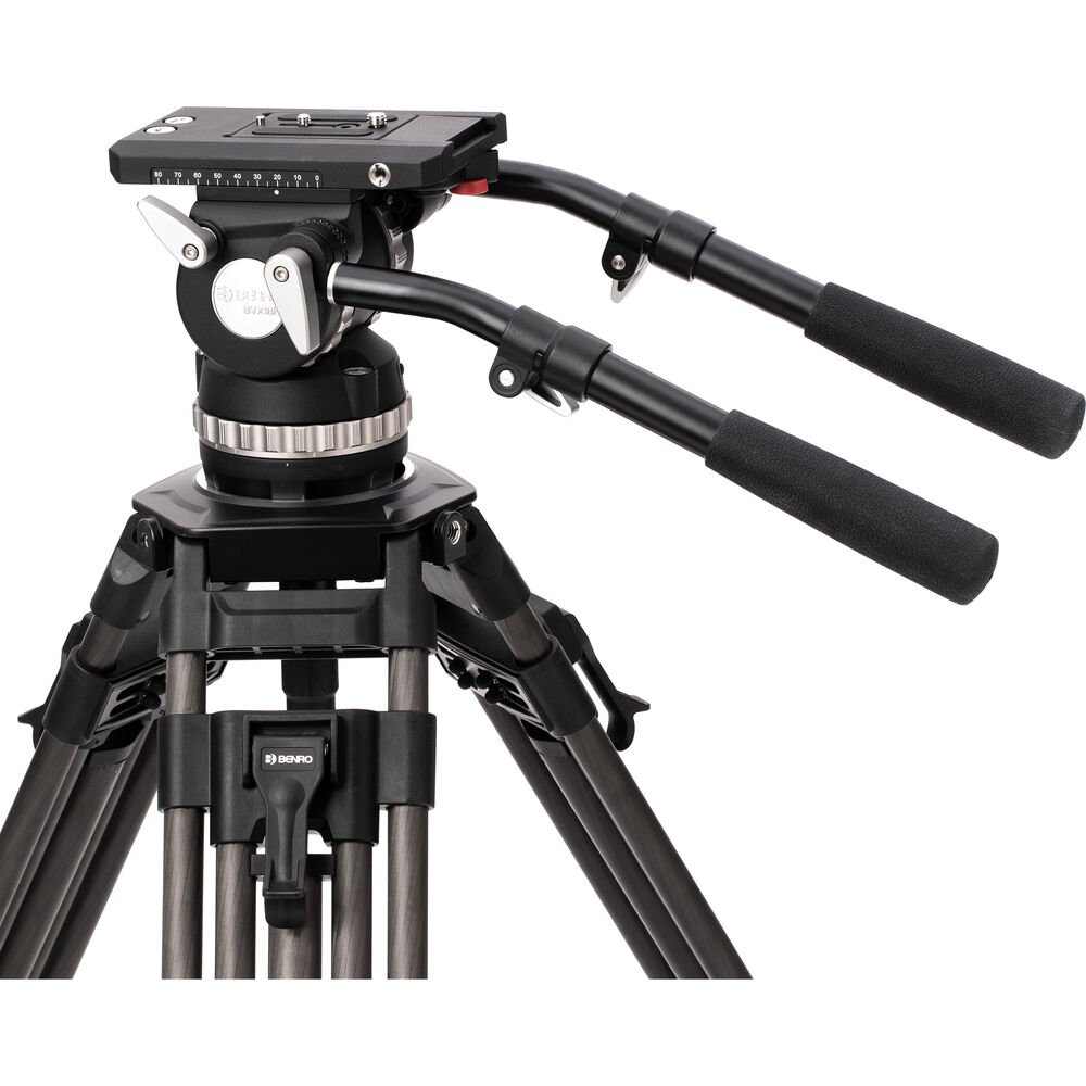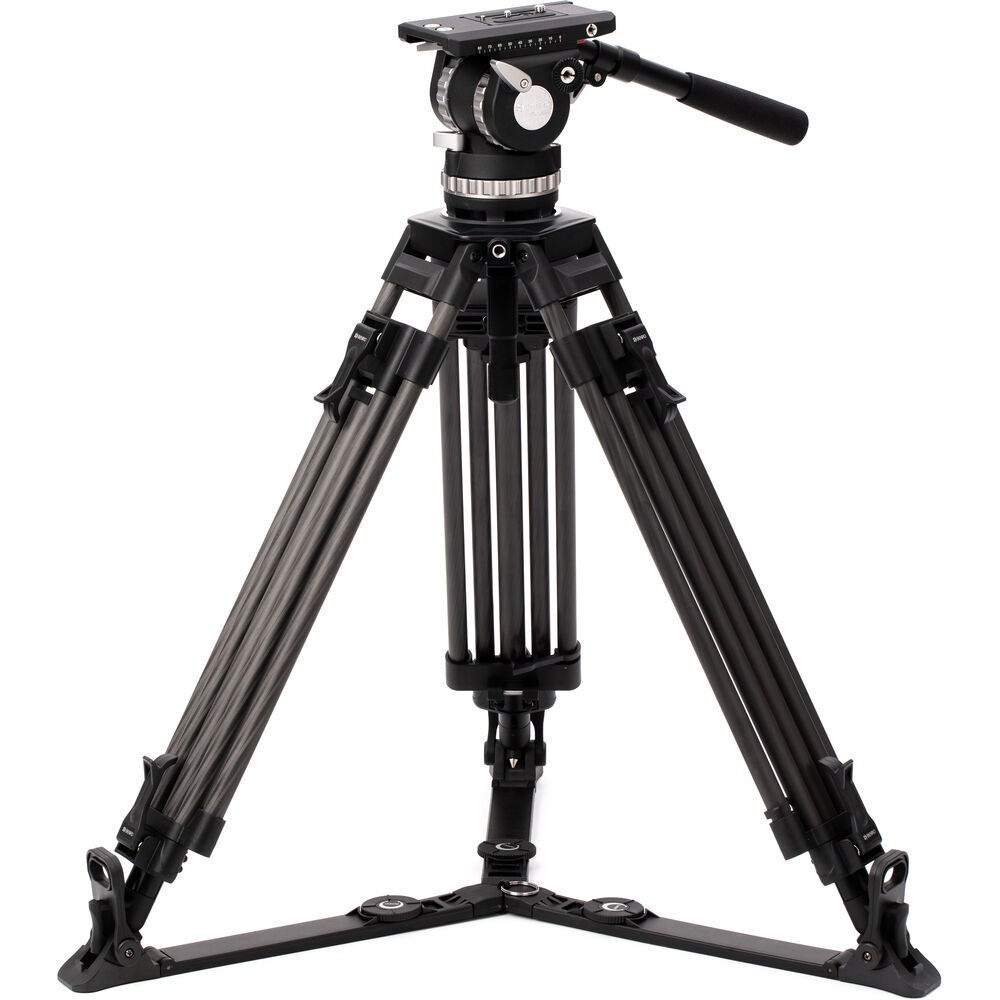A 100mm built-in bowl head has dual removable telescoping pan arms, and a quick release camera plate allows the easy mounting and removal of your rig. Balancing the plate is intuitive with locking mechanisms and a 10-step counterbalance. Included with the system is a carry case to hold everything, along with the additional handle, middle spreader, and removable feet. Its carbon fiber construction ensures a durable construction.