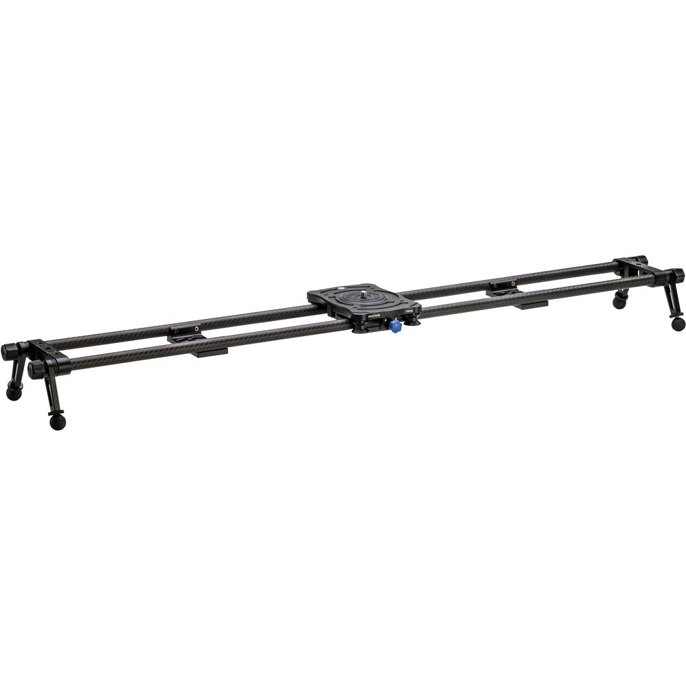 The slider features 18mm diameter carbon fiber rails and supports a total payload of up to 17.6 pounds. The slider can be mounted on a tripod or stands, or placed on a level surface. The built-in bubble level enables you to confirm that your slider is level. Each leg mounts onto the slider track ends via a rosette and can rotate throughout 360°, and each foot has approximately 4" of height adjustment for leveling. You can operate the slider on any angle from 0 to 90°, and you can even undersling the slider.
