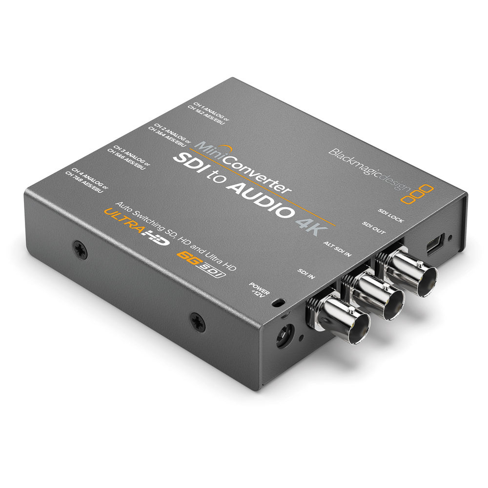 The Mini Converter SDI to Audio 4K from Blackmagic Design allows you to de-embed four channels of analog audio or eight channels of AES/EBU digital audio from any SDI video signal. It features a 6G-SDI input that accepts resolutions up to Ultra HD (3840x2160) and DCI 4K (4096x2160), and provides four 1/4" audio jack connectors for outputting the embedded analog or digital audio channels to an audio monitor, mixer, or other audio equipment. The SDI signal is output over a single 6G-SDI connector, with the resolution and frame rate matching that of the original input source.