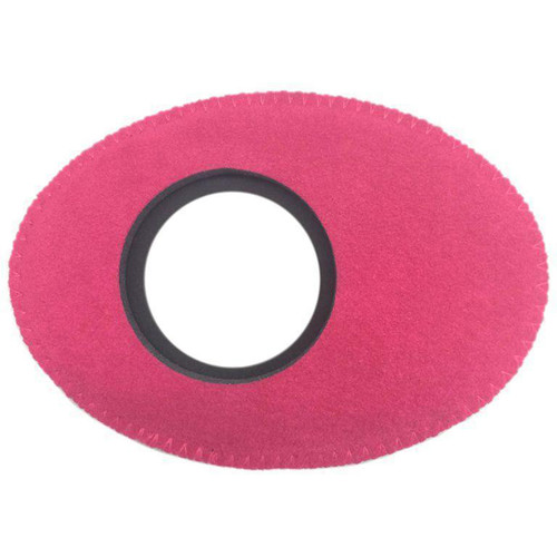 The Oval Extra-Large Viewfinder Eyecushion in pink Ultrasuede, from Bluestar, features outside dimensions of 5.1 x 3.6" to securely fit over many common external and built-in viewfinders. These include the Alphatron, the Kamerar QV-1, VF-4, and VF-4+ EVFs, the MagView 3:2, 4:3, and 16:9 EVFs, those of the Canon C100, C200, C300, C500, XF300, XF305, and XF205 HD cameras, the EVFs of the Sony FS5, HVR-S270, HXR-NX100, and PXW-Z150 cameras, and many more. This Ultrasuede version is made of 100% non-woven material consisting of intertwined, brushed, ultra-fine fiber strands. It provides a high level of softness and a superior moisture absorption rate, and it can be used in any climate.