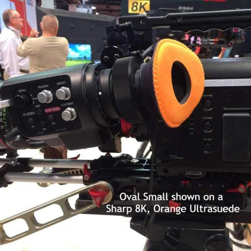 The Oval Small Viewfinder Eyecushion in orange fleece, from Bluestar, features outside dimensions of 3.8 x 3" to securely fit over many common external and built-in viewfinders. These include the GGS Perfect LCD Viewfinder, JJC ES-A6500G, LCDVF, and Letus Hawk, as well as those of the Sony Betacam, FS7, PXW-X320L, PXW-X320, PMW-400, and PMW-500 cameras. This fleece version is made of 100% synthetic material and provides a high level of softness and comfort for cold weather while enhancing light blockage. The fluffy feel reduces the rate of heat transfer, making the material feel warmer in cold conditions.