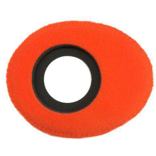 The Oval Ultra Small Viewfinder Eyecushion in orange fleece, from Bluestar, features outside dimensions of 3.3 x 2.6" to securely fit over many common external and built-in viewfinders. These include the Hoodman Hoodeye, JJC Oval Shape EyeShade, JJC Viewfinder, Bolex H16, and the viewfinder of the Panasonic GH5 with a compatible oval eyecup similar to the Hoodeye. This fleece version is made of 100% synthetic material and provides a high level of softness and comfort for cold weather while enhancing light blockage. The fluffy feel reduces the rate of heat transfer, making the material feel warmer in cold conditions.