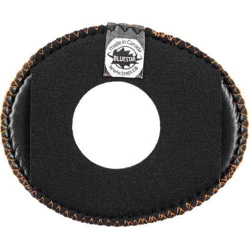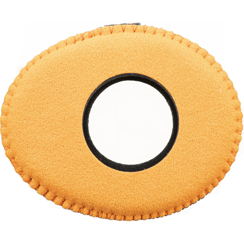 The Oval Ultra Small Viewfinder Eyecushion in orange Ultrasuede, from Bluestar, features outside dimensions of 3.3 x 2.6" to securely fit over many common external and built-in viewfinders. These include the Hoodman Hoodeye, JJC Oval Shape EyeShade, JJC Viewfinder, Bolex H16, and the viewfinder of the Panasonic GH5 with a compatible oval eyecup similar to the Hoodeye. This Ultrasuede version is made of 100% non-woven material consisting of intertwined, brushed, ultra-fine fiber strands. It provides a high level of softness and a superior moisture absorption rate, and it can be used in any climate.