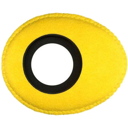 The Oval Ultra Small Viewfinder Eyecushion in yellow Ultrasuede, from Bluestar, features outside dimensions of 3.3 x 2.6" to securely fit over many common external and built-in viewfinders. These include the Hoodman Hoodeye, JJC Oval Shape EyeShade, JJC Viewfinder, Bolex H16, and the viewfinder of the Panasonic GH5 with a compatible oval eyecup similar to the Hoodeye. This Ultrasuede version is made of 100% non-woven material consisting of intertwined, brushed, ultra-fine fiber strands. It provides a high level of softness and a superior moisture absorption rate, and it can be used in any climate.