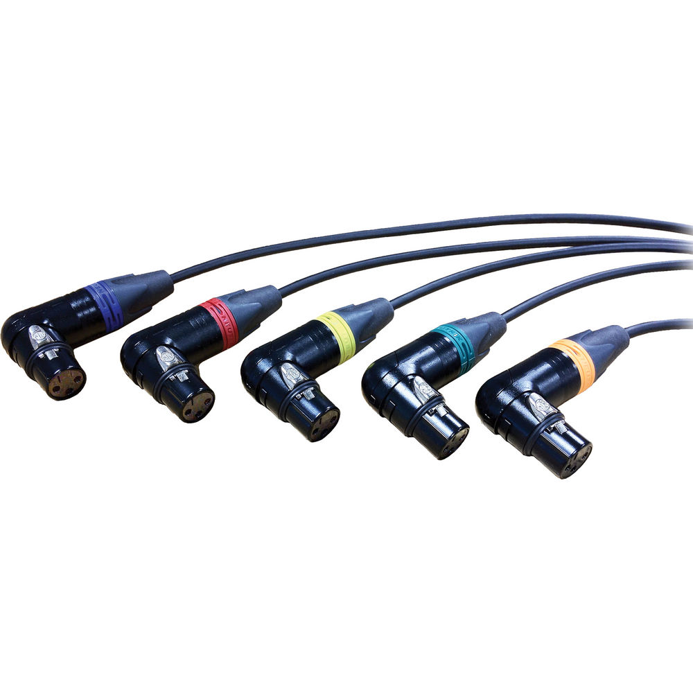 The Cable Techniques CT-PXR-SET 18” Lectrosonics UCR Receiver Bag Cable (Set of 5) is designed to connect Lectrosonics UCR-type receivers to XLR-3 mixer inputs in an over-the-shoulder audio bag. It features an XLR-3F right angle connector properly orientated away from the DC socket to a straight XLR-3M. The cable is made using Neutrik XX series XLR connectors and Canare L2E5 cable. The black connector shells contain gold pins and pin-1 is tied to shells on both the connectors.