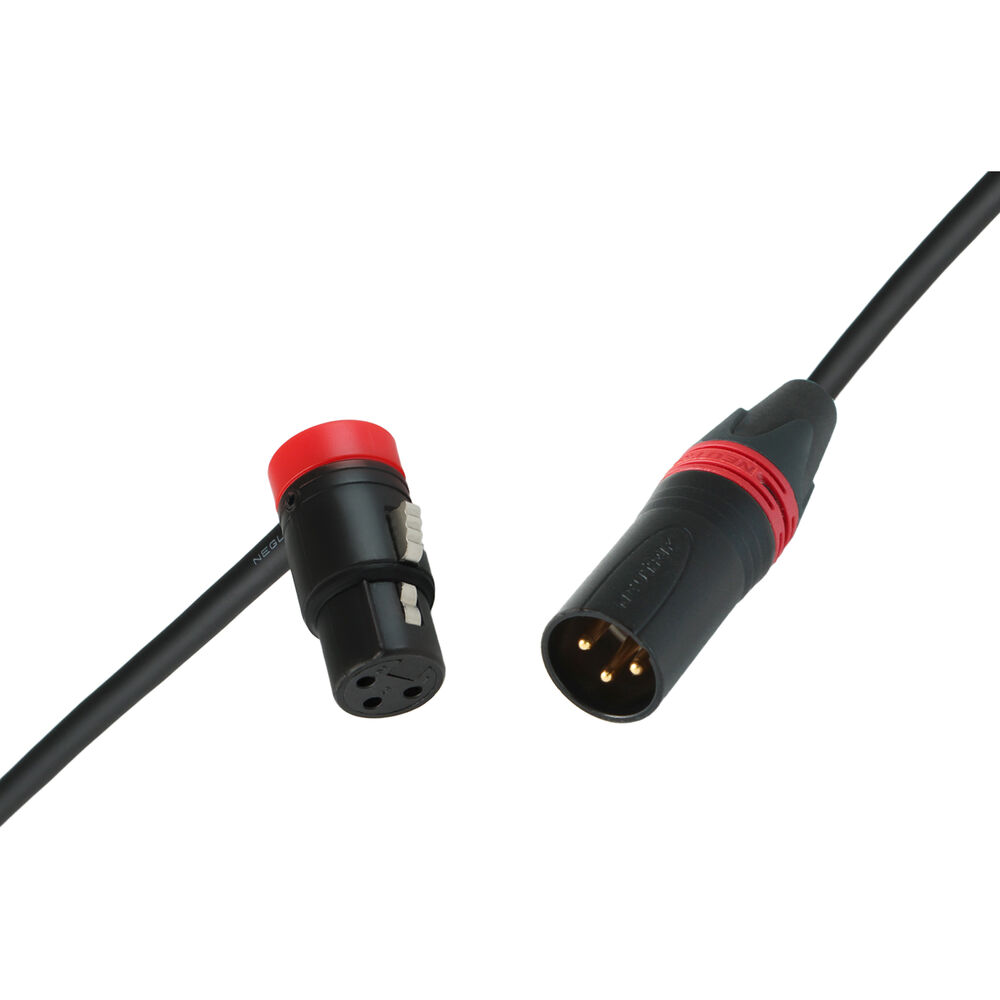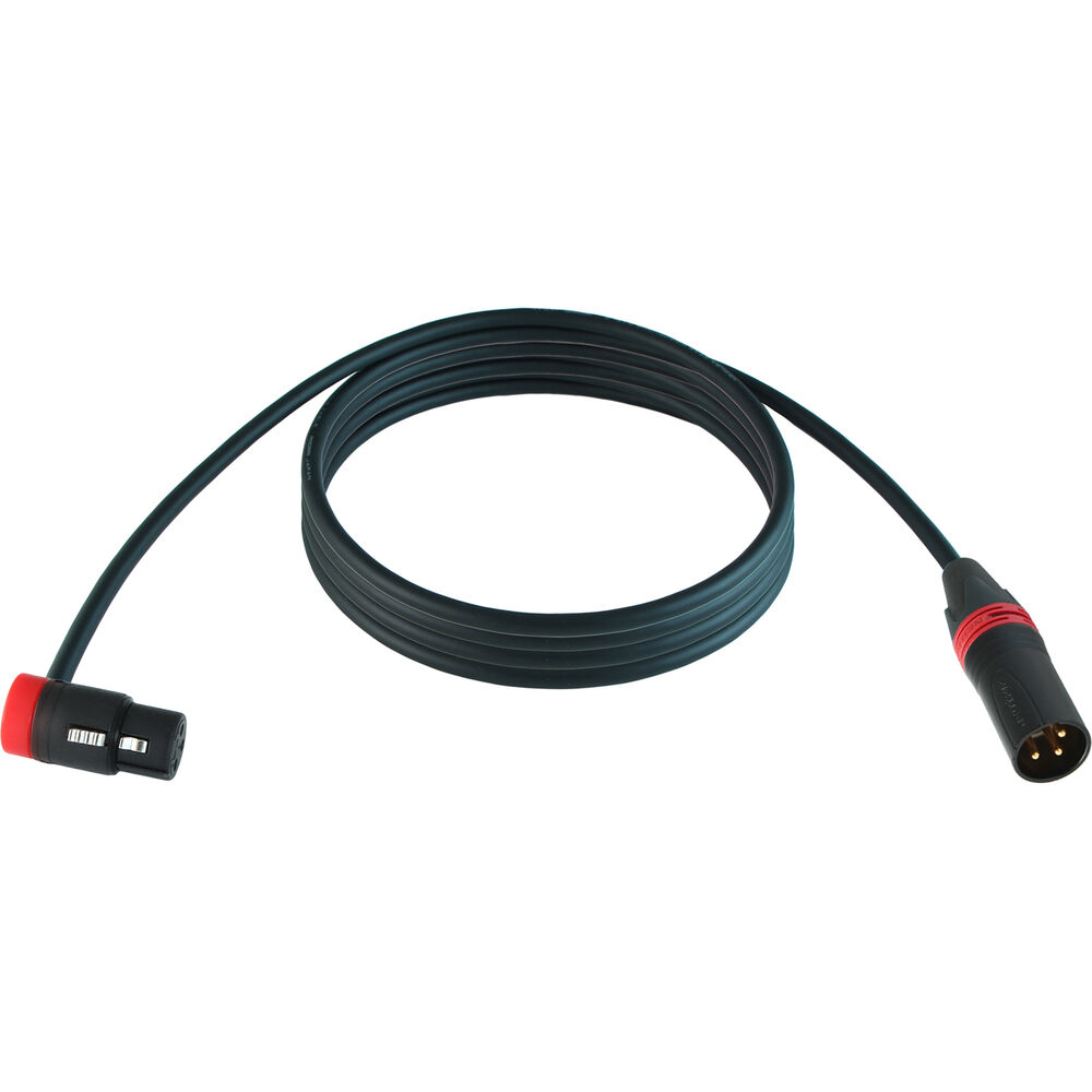 The 25' cable is terminated with a low-profile, right-angle XLR-3 female connector (with a red cap) at one end and a straight XLR-3 male Neutrik XX Series connector (with a red ring) at the other. You can adjust the low-profile XLR cable outlet orientation to fine-tune it to your exact needs with a 120° swing.