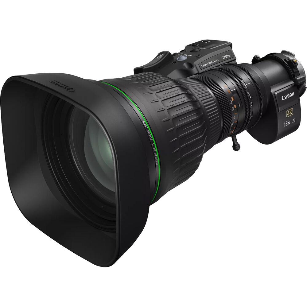 Designed for use with 2/3" broadcast camcorders, the compact, full-servo CJ18ex28B IASE T 2/3" UHDGC Super-Telephoto Lens from Canon features HDR dynamic range and super-telephoto versatility for ENG, nature, and sports capture. It offers an 18x zoom ratio, and a focal length range of 28-500mm and 56-1000mm using the built-in 2x extender.