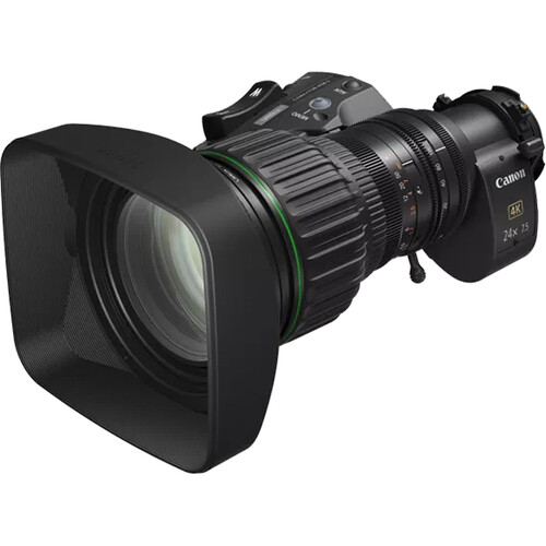 Capture UHD 4K footage with the 7.5-180mm CJ24ex7.5B IASE S 4K UHDgc 2/3" 24x Portable Telephoto Servo Zoom Lens from Canon. The CJ24ex7.5B IASE S is a 24x zoom lens for 2/3" format ENG/EFP cameras that features a compact, lightweight design, a built-in 2x extender, and support for UHD 4K and HDR footage and the BT.2020 wide color gamut. The Type-S servo drive increases the lens' operational efficiency and reduces power consumption. This lens incorporates a B4 mount that is standard for ENG/EFP lenses.