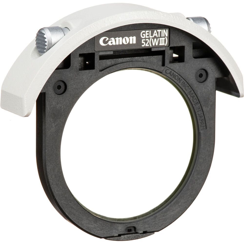 A simple way to use filters in conjunction with select Canon super-telephoto lenses, the Drop-In Gelatin Filter Holder 52 (WIII) can be used to hold cut gel filters in the rear of the lens. Gels are held in place by a clamping mechanism.