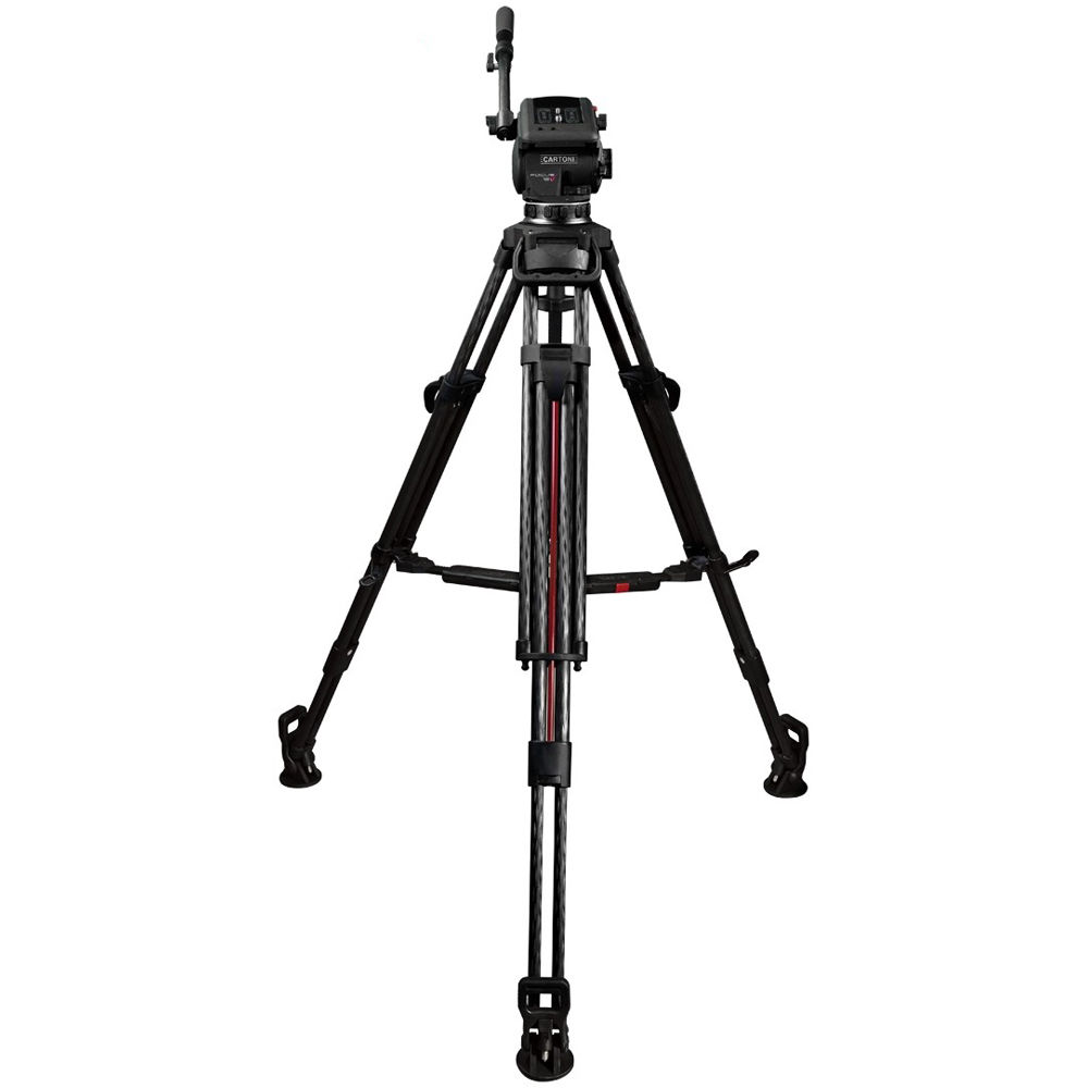 Featuring ±90° tilt, 360° pan range, and a continuously variable fluid-damping system on both pan and tilt movements, the Cartoni Focus 12 Fluid Head with 2-Stage carbon fiber Smart-Stop SDS Tripod System is suitable for use with cameras and accessories weighing up to 26 pounds. The fluid head features a quick release Euro-style camera plate, an illuminated spirit level, and a telescopic pan handle. The Focus 12 fluid head features a continuously variable counterbalance system. Its 100mm bowl base provides a wide support that makes it suitable for larger cameras.
