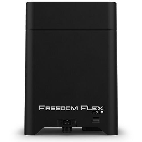 Each of the Freedom Flex H9 IP fixtures include an integrated D-Fi transceiver to wireless DMX control with 3 control modes (6, 8, 16 channels). The rechargeable battery pack is replaceable and can be set to specific run times including 3, 5, 8, and 12 hours. Convenient, wireless non-DMX control is available using the optional RFC and RFC-XL remotes and customized colors can be created using the built-in LED display. The compact design allows the fixture to be placed inside trussing. The Freedom Par H9 IP ships with a power cord.