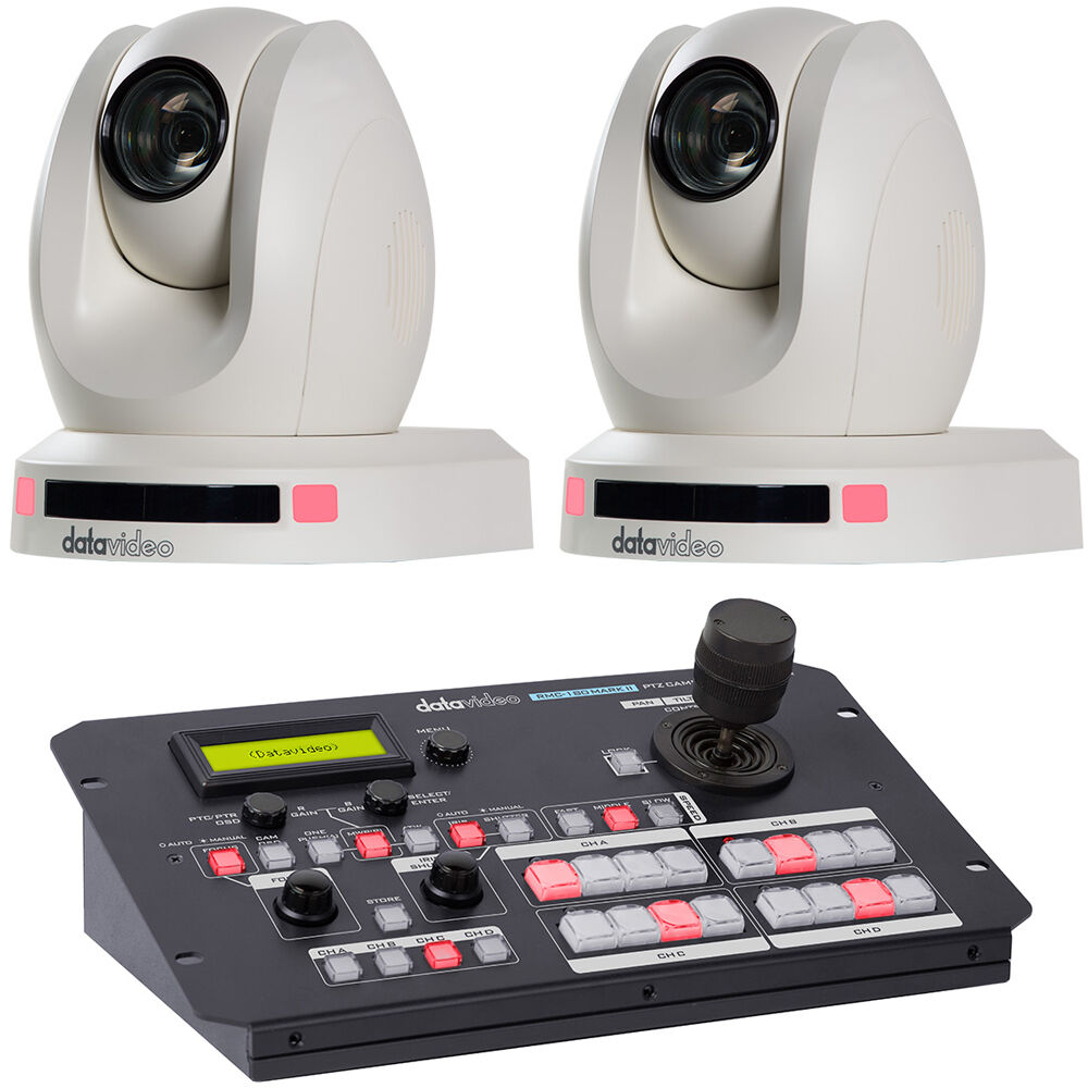 This white 2 x PTC-140 Camera Kit with RMC-180 Mark II Controller from Datavideo supports HD production and is an excellent choice for house of worship, education, and corporate work. The included controller supports up to four cameras, controlling their position and movement. The two included cameras support control via DVIP and VISCA/Pelco-P/D Serial Control, support RTSP and RTMP streaming protocols, and output HD video via HDMI or HD-SDI connectors.