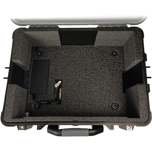 This case's interior includes one foam piece in the lid and three foam fittings in the main compartment. Wheel the case along using the retractable handle or grasp it using the large, hinged top handle.