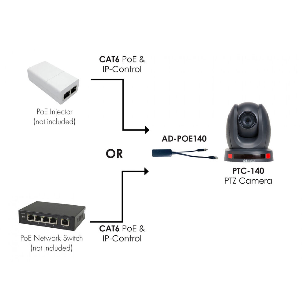 The PoE Adapter for PTC 140 Camera from Datavideo provides PoE (Power-over-Ethernet) to the Datavideo PTC-140 camera, eliminating the need for an AC power supply.