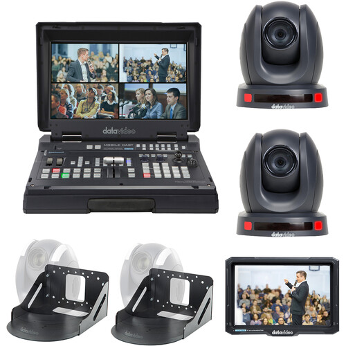 Create a high-resolution mobile broadcast video production with this black HS-1600T Mark II Portable Web Production Studio with 2 x PTZ Cameras & Wall Mounts from Datavideo. The studio kit provides you with a mobile switcher that supports three HDBaseT inputs and a single HDMI input as well as two PTZ cameras, two camera wall mounts, and a 7" monitor. The HS-1600T Mark II switcher features a built-in 17.3" monitor, a T-bar, a joystick, and control-panel buttons, and it supports tally function. It is the heart of the kit that enables you to set up a mini studio virtually anywhere you have power.