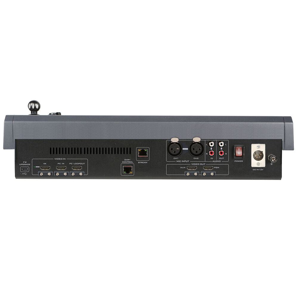 The switcher combines touchscreen functionality with traditional switcher tools such as backlit push buttons, a joystick, and a zoom scroll wheel to provide an all-in-one switching device. It features 3-pin XLR and RCA inputs for analog audio input. The built-in encoder supports H.264, enabling you to stream to any CDN-compatible site, and the switcher is compatible with optional OBS live streaming software. You can power the switcher using the included AC to DC power adapter, or via 12 VDC batteries via the 4-pin XLR power port.