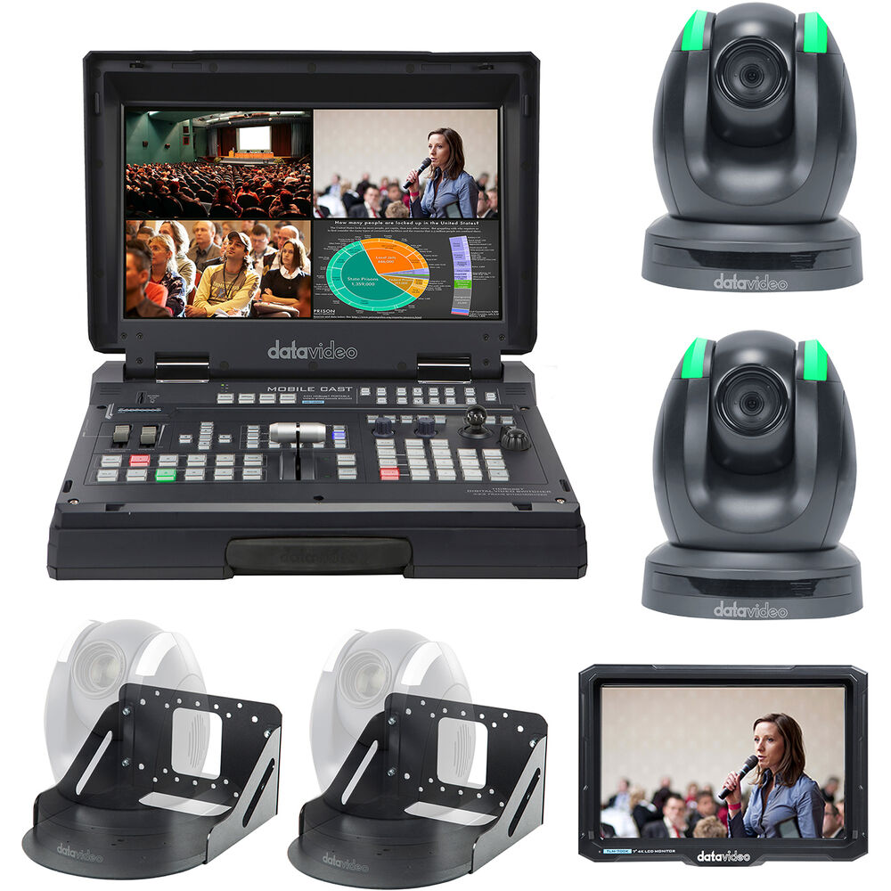 Add a compact PTZ camera streaming solution to your classroom, house of worship, or corporate conference room with this black Streaming Studio Kit with Switcher, 2 x PTZ Cameras, Wall Mounts & Monitor from Datavideo. The HS-1600T Mark II mobile switcher supports a single HDMI and three HDBaseT inputs, a single HDBaseT and three HDMI outputs, and a two-channel XLR audio input. Two PTZ cameras, a 7" monitor, and two WM-1 professional wall mounts are also included with the kit.