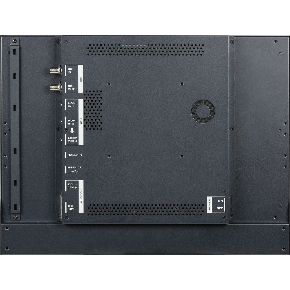 The monitor features a large, dual-color LED tally light on the front at the top, indicating live or cued status, that is controlled using the tally input on the back. The display features a ±89° angle of view, 300 cd/² brightness, a 700:1 contrast ratio, dual speakers, and a headphone jack. Image management features include pixel zoom up to 8x, blue only, markers, underscan, H/V delay, waveform, peaking, false color, image flip, safe frame, and more. The monitor comes with an adjustable, tilting desktop stand.