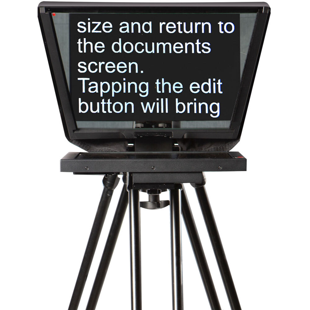 The TP-700 Large-Screen Prompter Kit from Datavideo is a professional teleprompter designed to be controlled wirelessly by a production team instead of talent. It features a streamlined design that features a 15" monitor with integrated dvPrompter Plus app, 70/30 beamsplitter glass, a cloth hood with frame, and a camera mounting rail, making it ideal for conferencing, government, corporate, education, and broadcast studios.