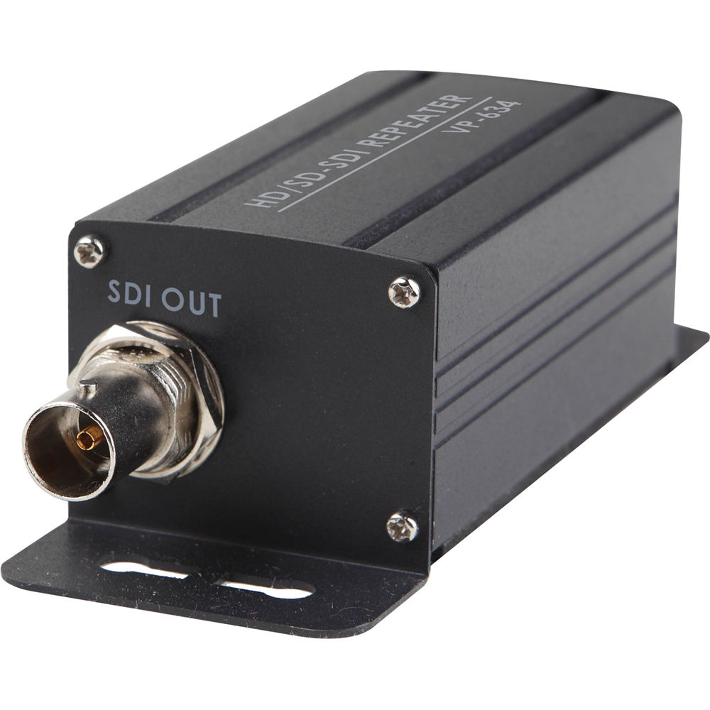 The Datavideo VP-634 3G/HD/SD-SDI Repeater is a non-powered complement to the optional VP-633. Both extend an SDI video signal along with embedded audio 328 ft. Both re-clock to maintain signal quality. And both support resolutions up to 1080p/60 NTSC or 1080p/50 PAL, automatically detecting whether the input is NTSC or PAL. The 633, however, is DC-powered and meant only to serve as the initial extension unit, the first link in the extension chain. The 634 only joins at the end of the first 328 ft and thereafter every 328 ft. The initial unit -- the 633 -- will feed power to as many 634 units as you connect.