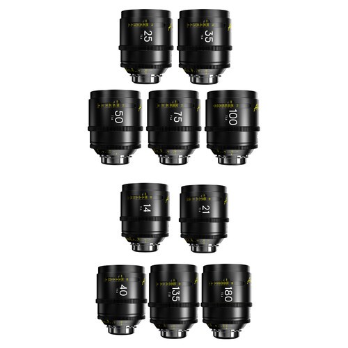 This DZOFilm Arles FF/VV Prime Cine 10-Lens Set includes 10 focal lengths spanning a comprehensive range from wide to telephoto. This ARRI PL full-frame compatible set comprises 14, 21, 25, 35, 40, 50, 75, 100, 135, and 180mm lenses plus a lens case. All the lenses share similar gearing, iris blades, front diameters, and aperture ranges for easy switching. See below for more information on the individual lenses included in this kit.