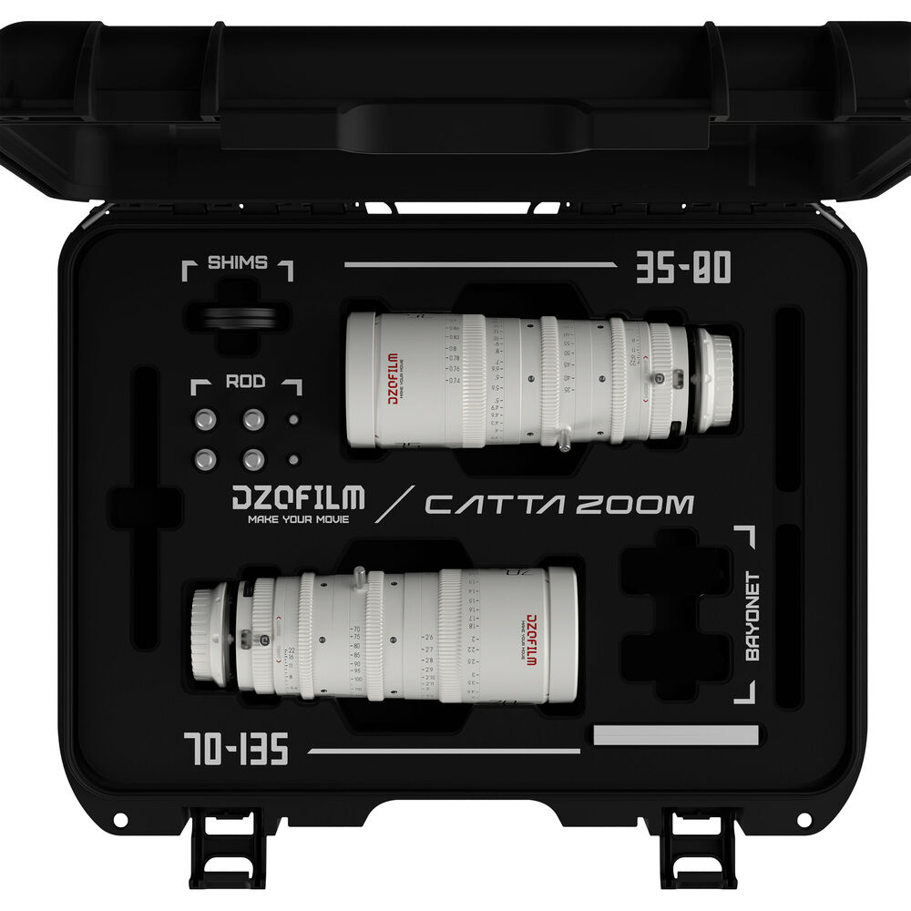 The bundle includes the Catta 35 to 80mm cinema lens, the Catta 70 to 135mm cinema lens, and a hard-shell case. Both lenses come with an E-mount that can be interchanged with optional RF, L, X, or Z mounts, and each lens comes in a stylish white color.