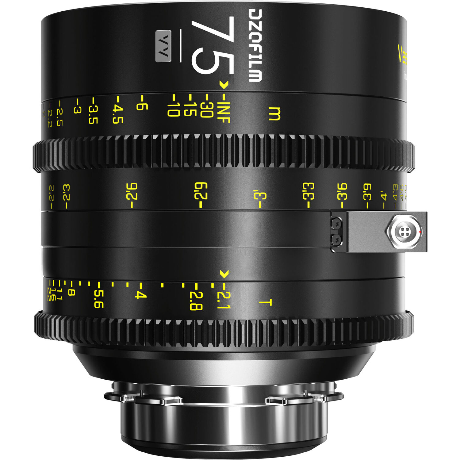 The DZOFilm VESPID Cyber Full Frame 75mm T2.1 Prime Lens is part of the VESPID series of lenses and well suited for independent and high-end full frame cinematography. The Cyber part of its data connection passes aperture and focus data to assist with VFX and post-production workflows. The lens has a 95mm front diameter, allowing it to work with virtually any cine-style matte box, and it matches the other VESPID Cyber lenses. The small size makes this lens an attractive option when working with drones and gimbals, as well as when shooting handheld or run-and-gun. Sporting interchangeable lens mounts, this fully manual lens works with cameras having PL or EF mounts. The full frame lens coverage supports sensors with an image circle up to 46.5mm for use on cameras with sensors up to full frame without any vignetting.
